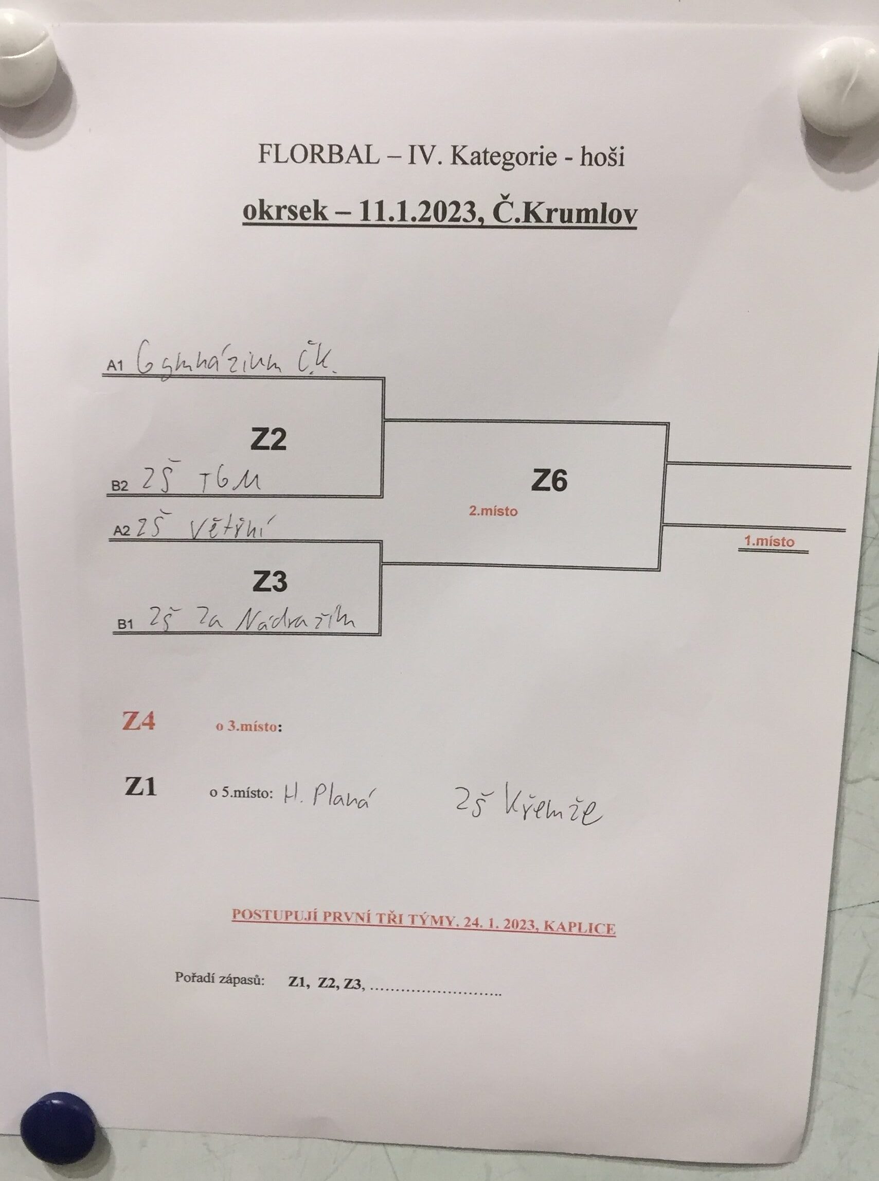 Dnes 11. 1. 2023 se ve sportovní hale v ČK konalo okrskové kolo ve florbale (kategorie 8. a 9. ročník chlapci). Naši žáci zahájili ve své skupině dvěma zápasy, které shodně remizovali 1:1 (střelci gólů: M. Puffr, M. Veselý). Poté následovalo semifinále, kde chlapci narazili na Gymnázium ČK. Silný boj o každý míček skončil vítězstvím 3:0 (střelci: M. Štrbko, M. Puffr, P. Pavlíček), také je zde třeba vyzdvihnout výborně chytajícího brankáře – A. Lipovský. Poté už následovalo velmi těžké finále se ZŠ Za Nádražím, bohužel v tomto zápasu byl soupeř lepší a TGM podlehlo 0:3.
