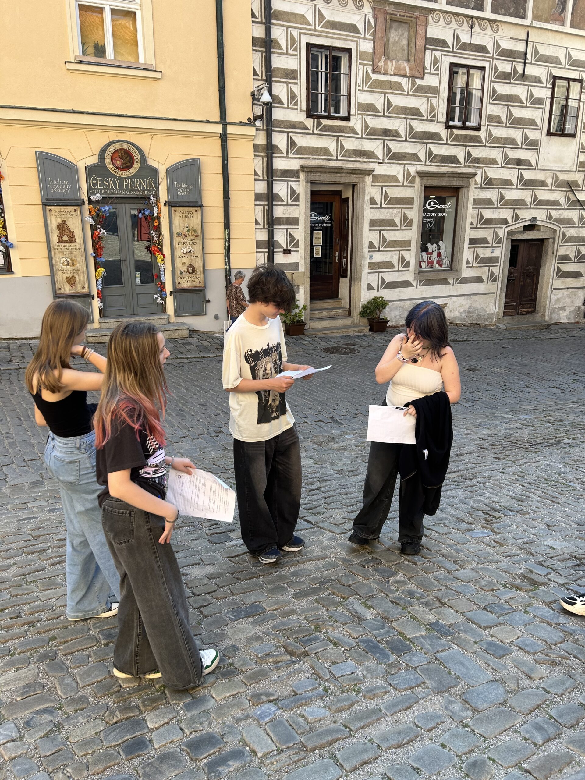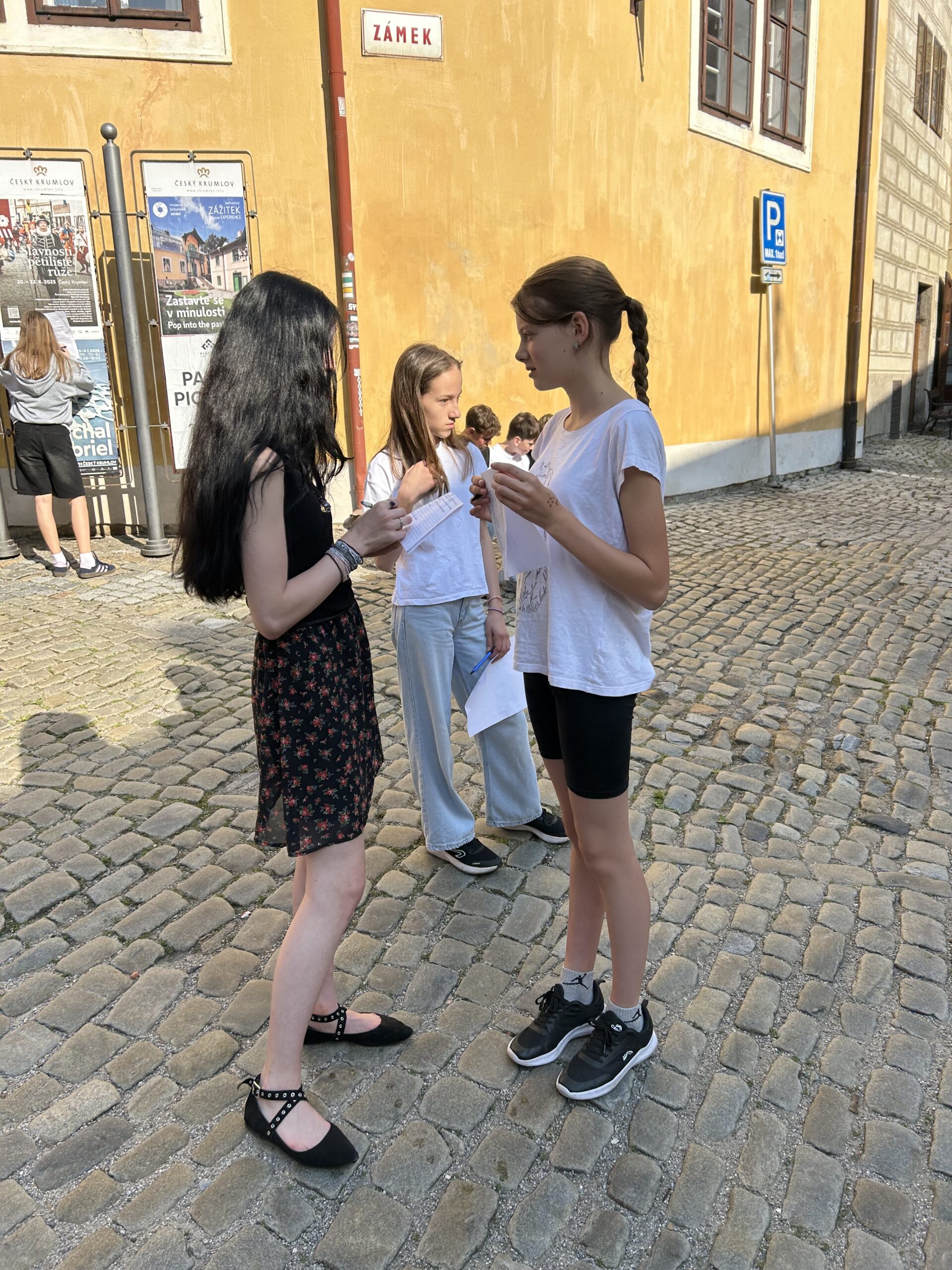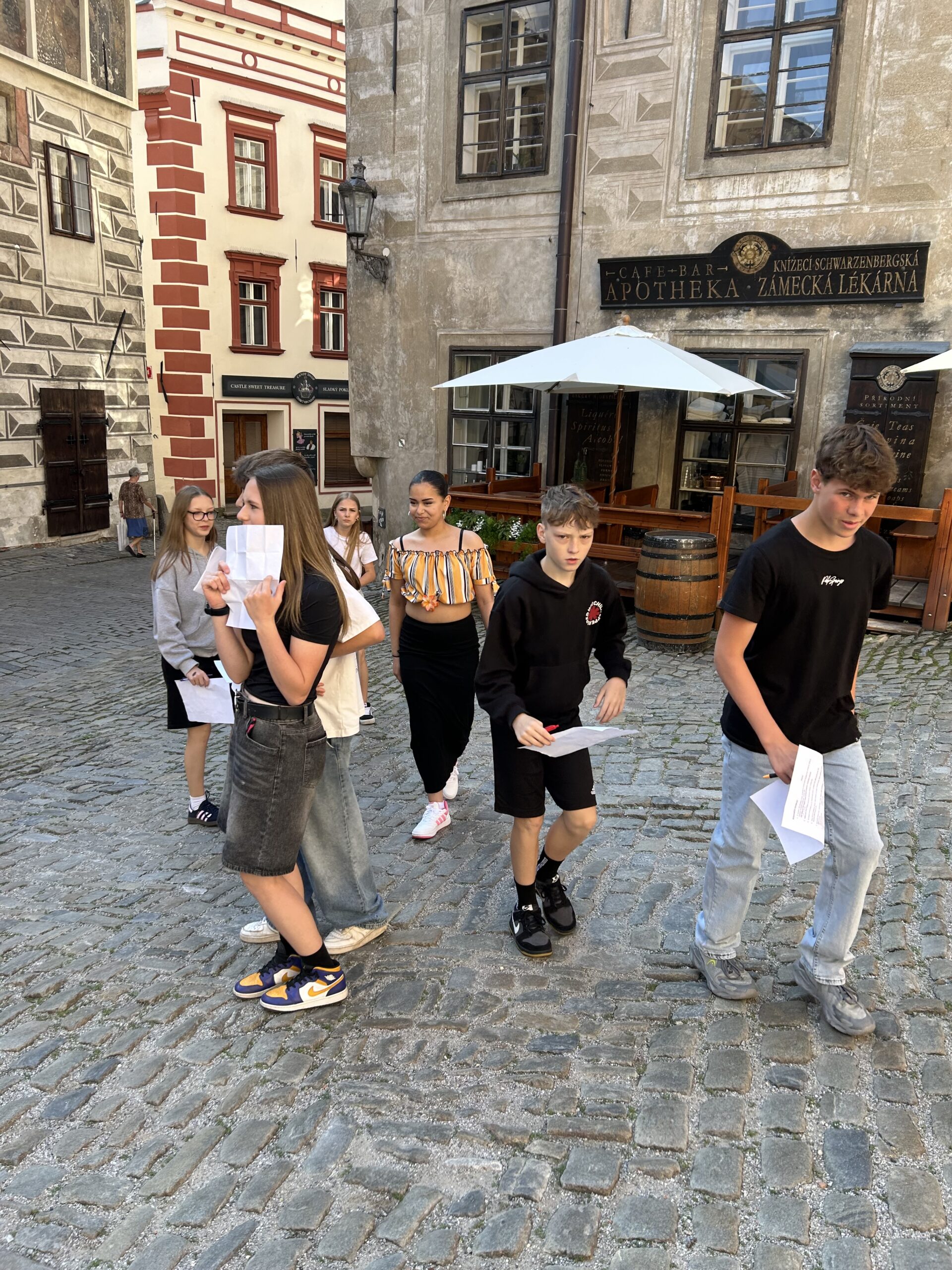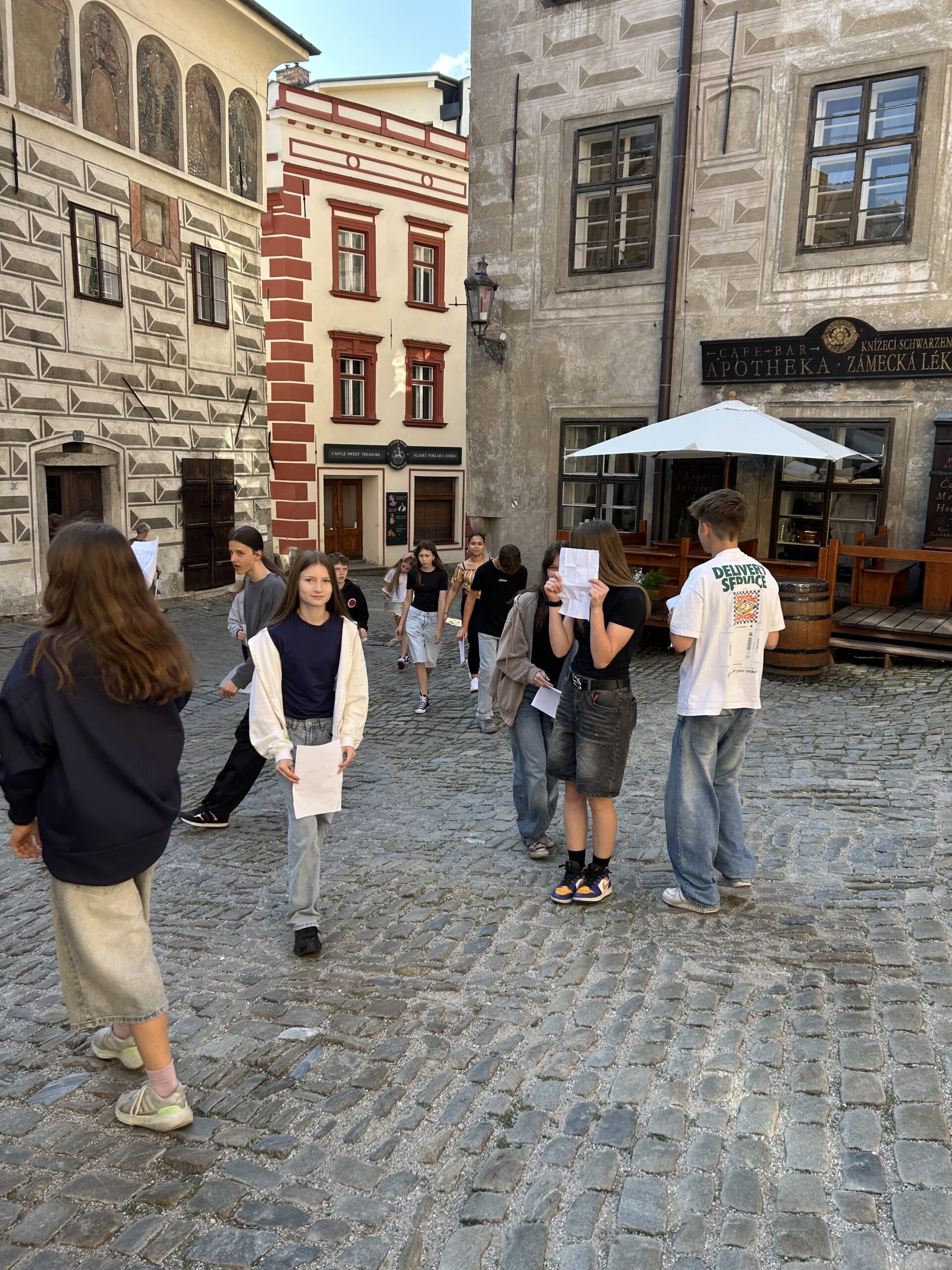 Jednoho slunečného dne se třída 7. A vydala na poznávací procházku historickým centrem Českého Krumlova. Cílem výletu nebylo jen projít si město, ale pozorně vnímat detaily, které by běžný turista možná přehlédl – sgrafitovou výzdobu, architektonické prvky a symboliku, která oživuje stěny domů a ulic.