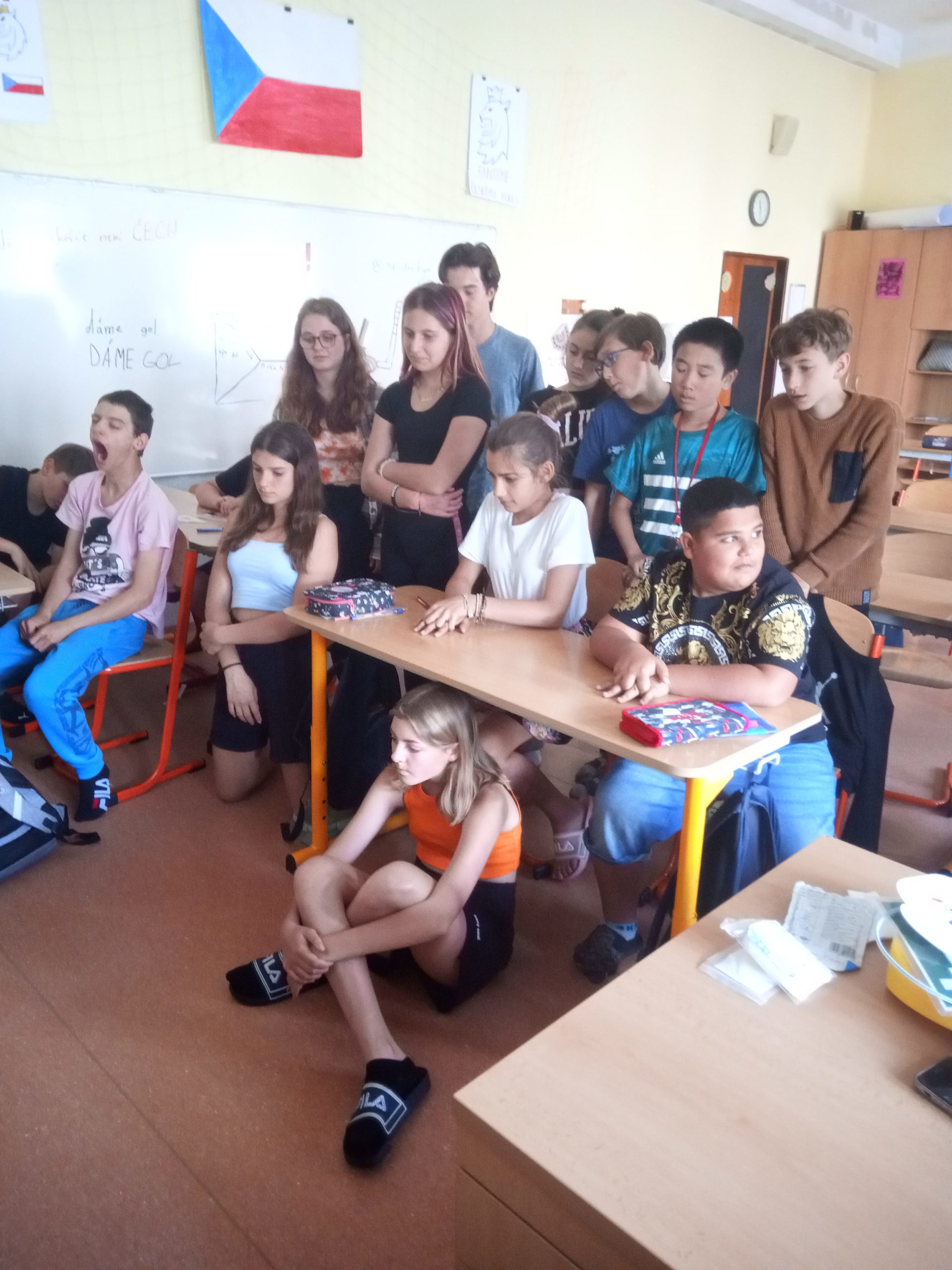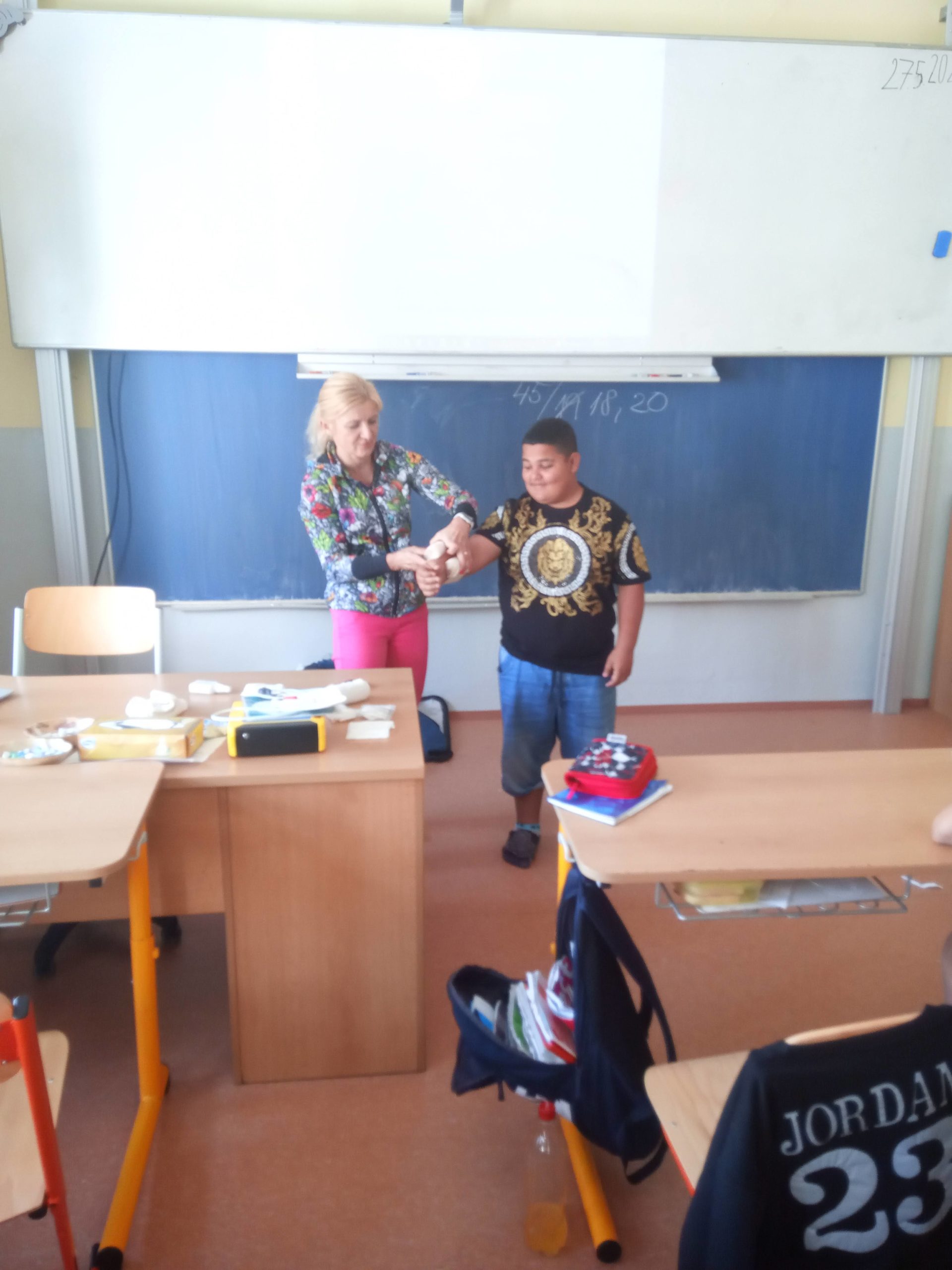 V pátek jsme měli přednášku o první pomoci, ohodnotila bych ji 10 body z 10, protože to bylo poučné i zábavné. Připomněli jsme si čísla policie, hasičů, záchranky. Ukázali jsme si, jak dělat první pomoc, co dělat, když se spálíme nebo nám začne téct krev z nosu.