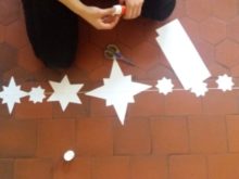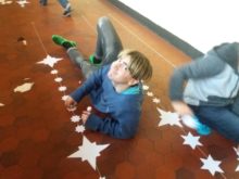 Třída 8. B se vyřádila při vánoční výzdobě školy. Vystříhat hvězdy, nalepit na provázky a pověsit ozdobené provázky na zábradlí. Kompletování muselo probíhat na chodbách, jinde nebyl dostatečný prostor. Ale stálo to za to.
