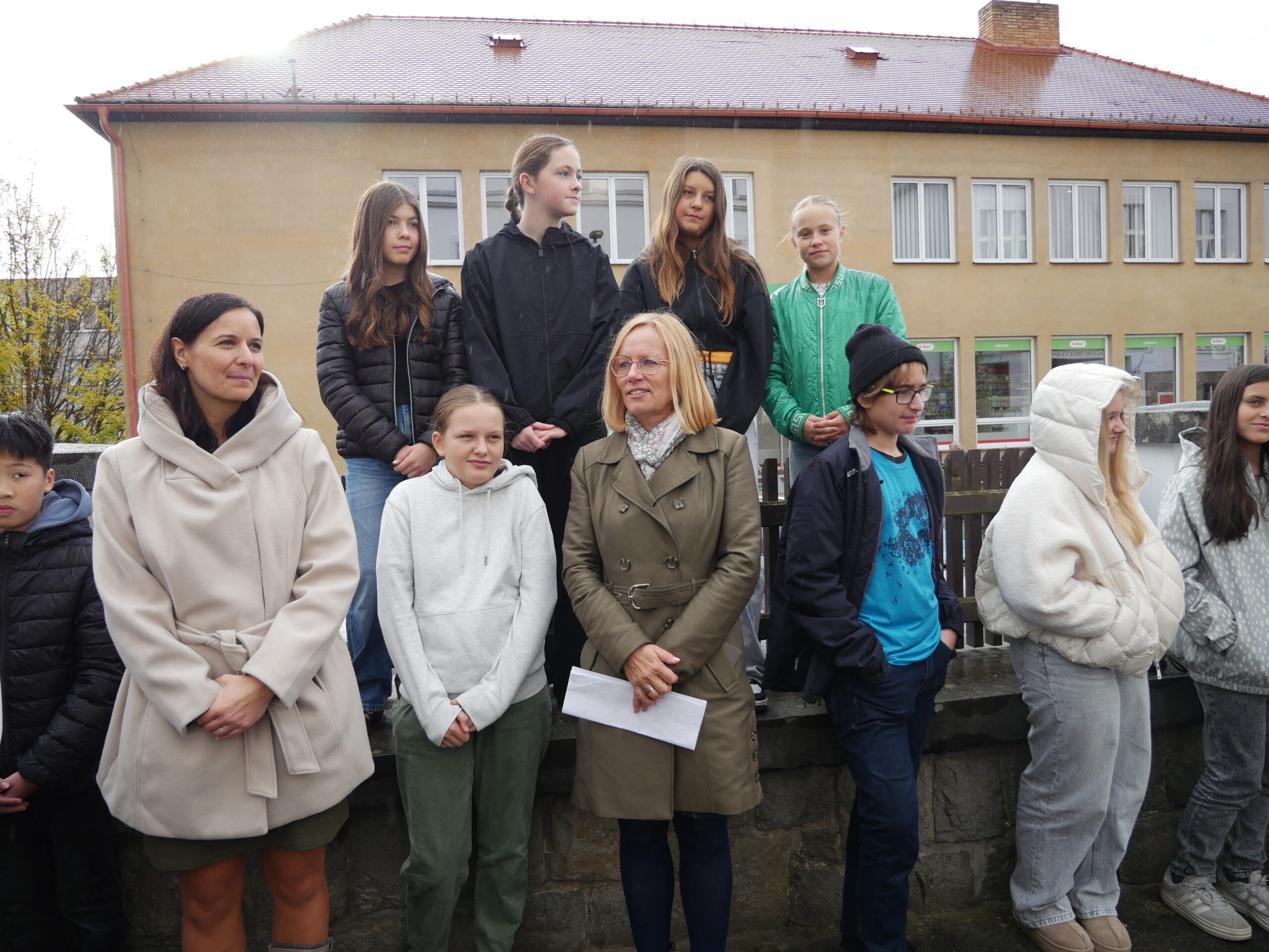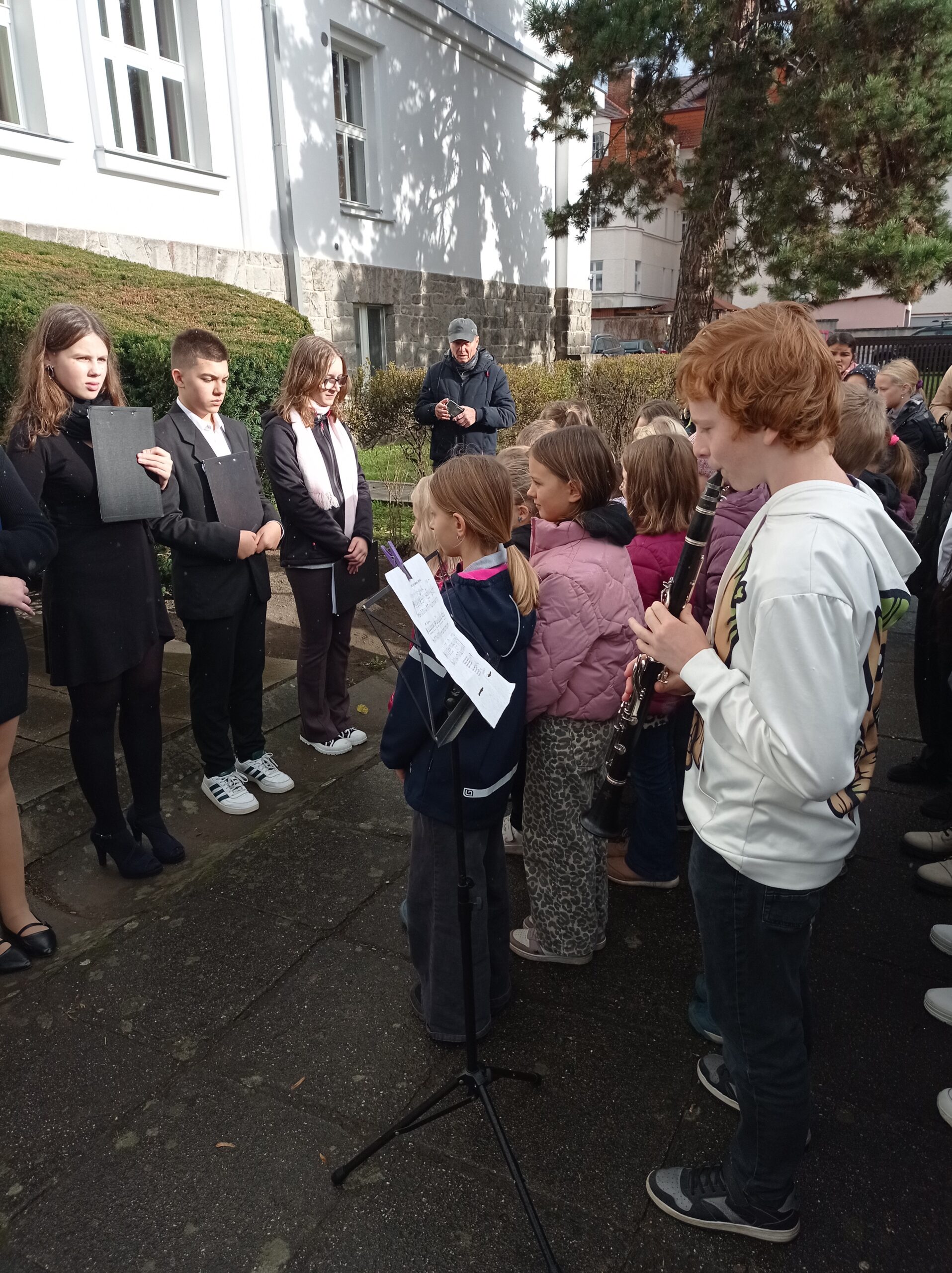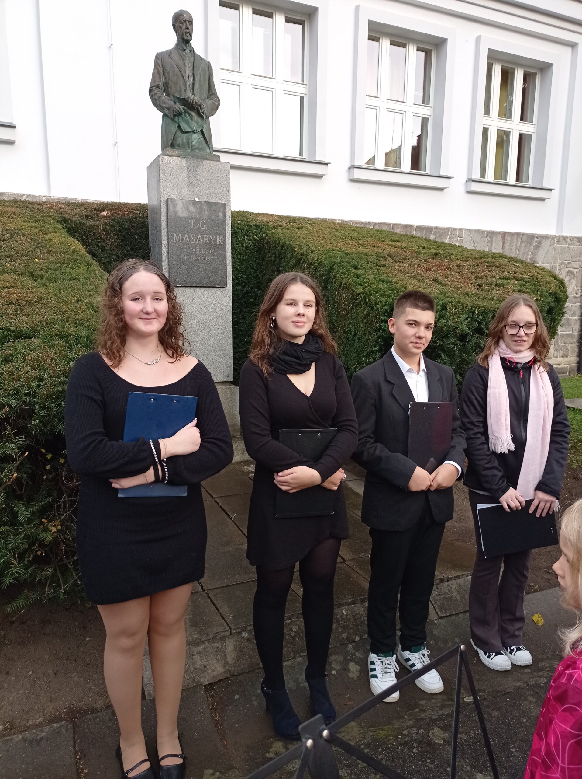 V pátek 24. 10. 2025 se u busty T. G. Masaryka před naší školou uskutečnila již tradiční vzpomínková akce k příležitosti 107. výročí vzniku samostatného Československa. Pietního setkání se zúčastnili starosta města Alexandr Nogrády, ředitel školy Mgr. Josef Haláček, učitelé a žáci naší školy. Celý program zahájil školní sbor českou hymnou. Sofie Hanzlíková, Kristýna Štěpánková, Michal Kaločai a Veronika Pěstová si pro přítomné připravili krátké literární pásmo. Zazněly básně a úryvky Masarykových myšlenek. Na závěr jsme si poslechli lidovou píseň Ach synku, synku v podání pěveckého sboru, na klarinet zahrál Jakub Cifreund.