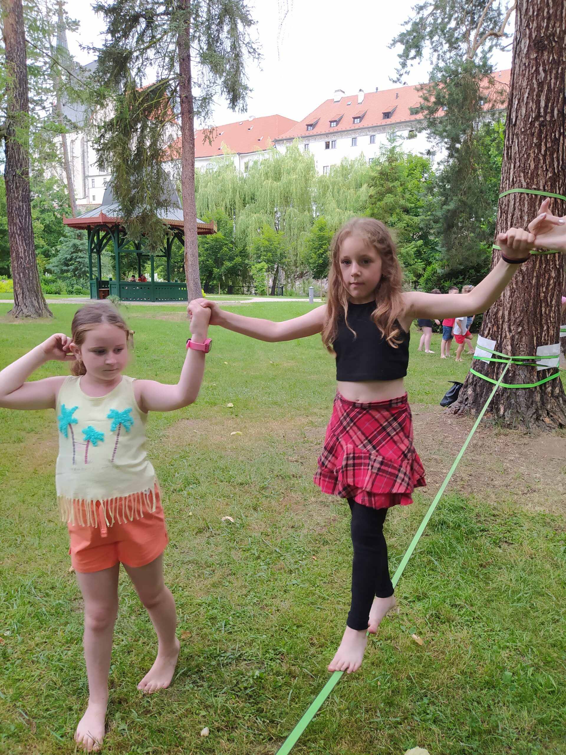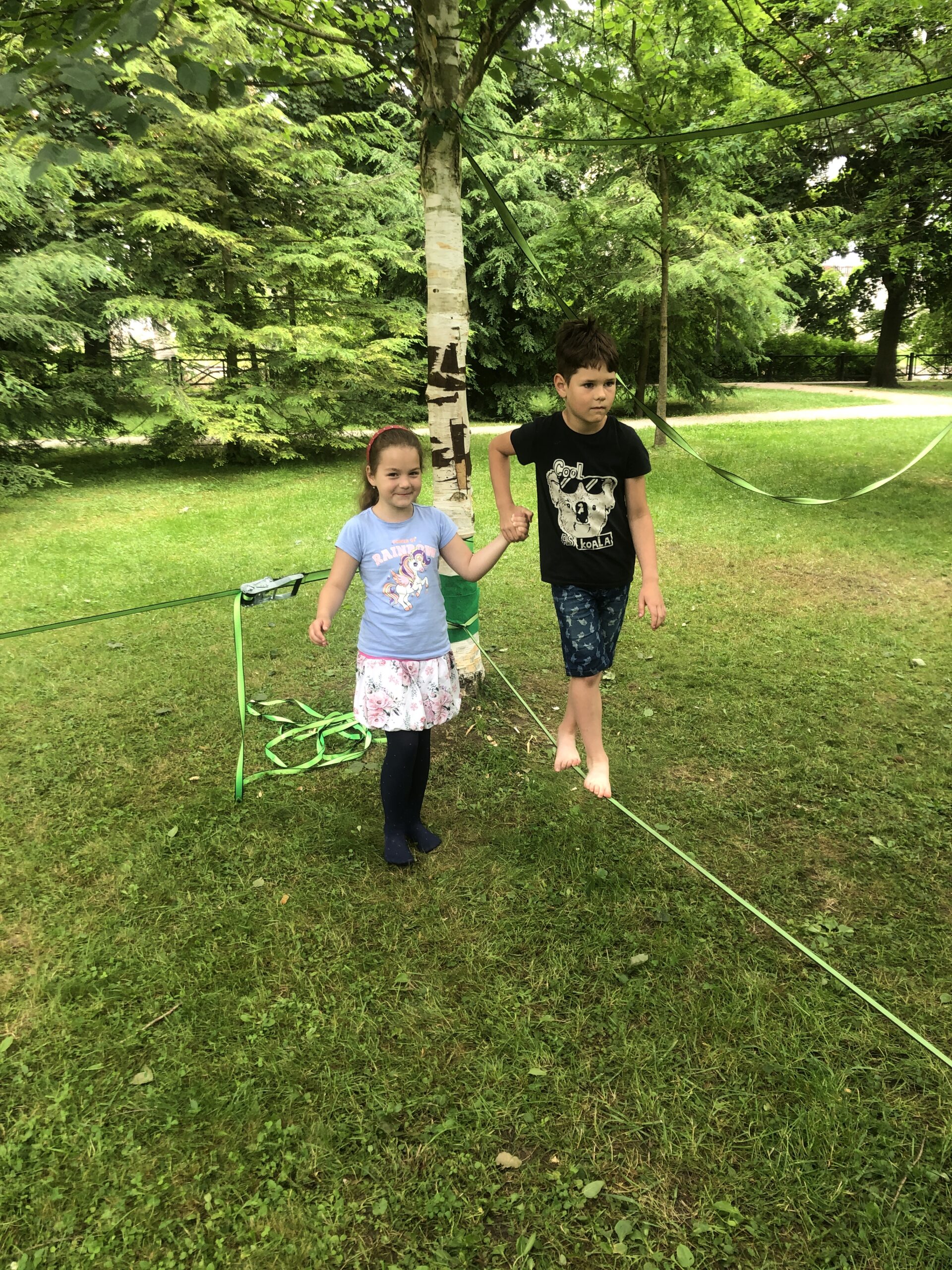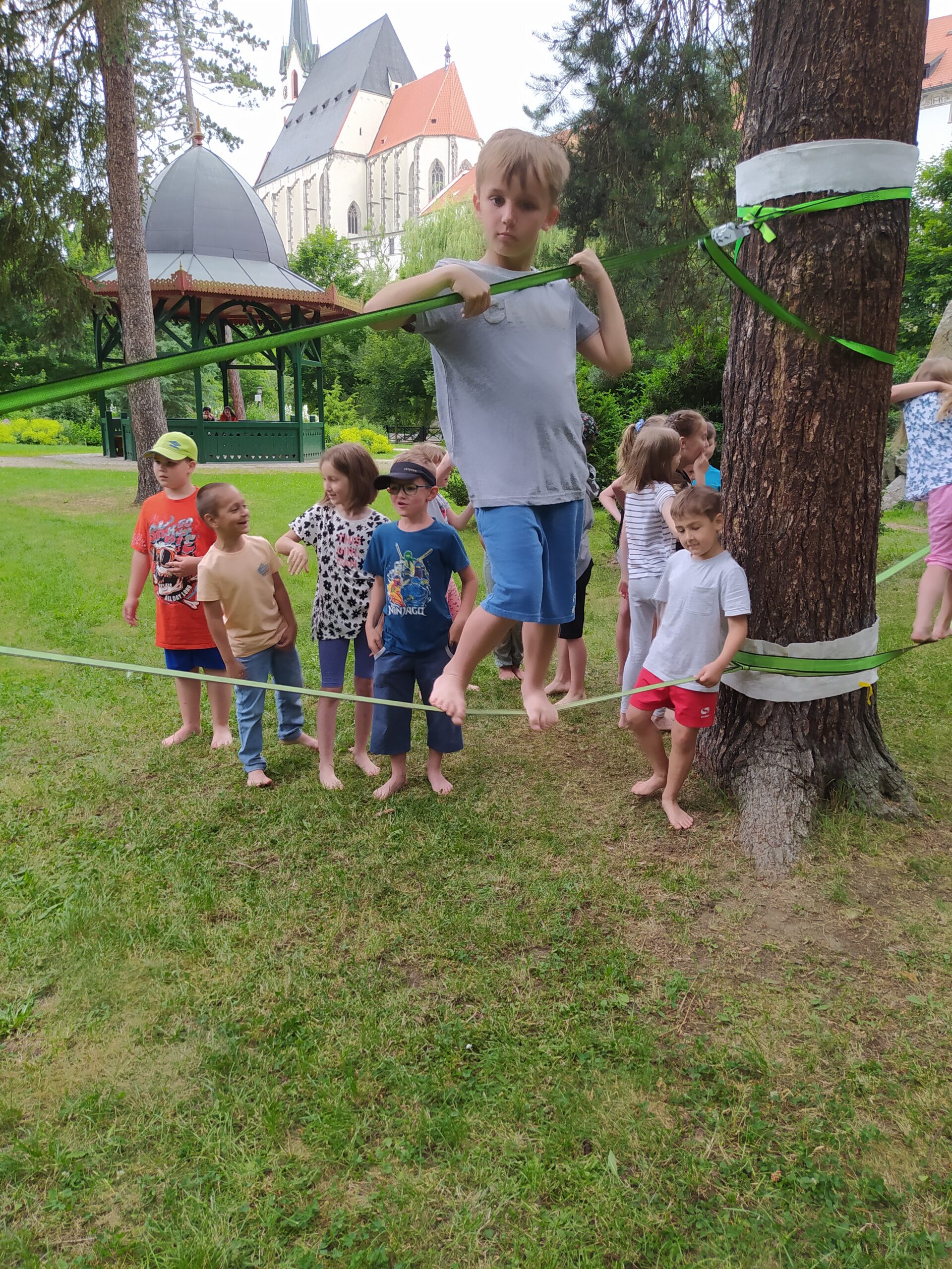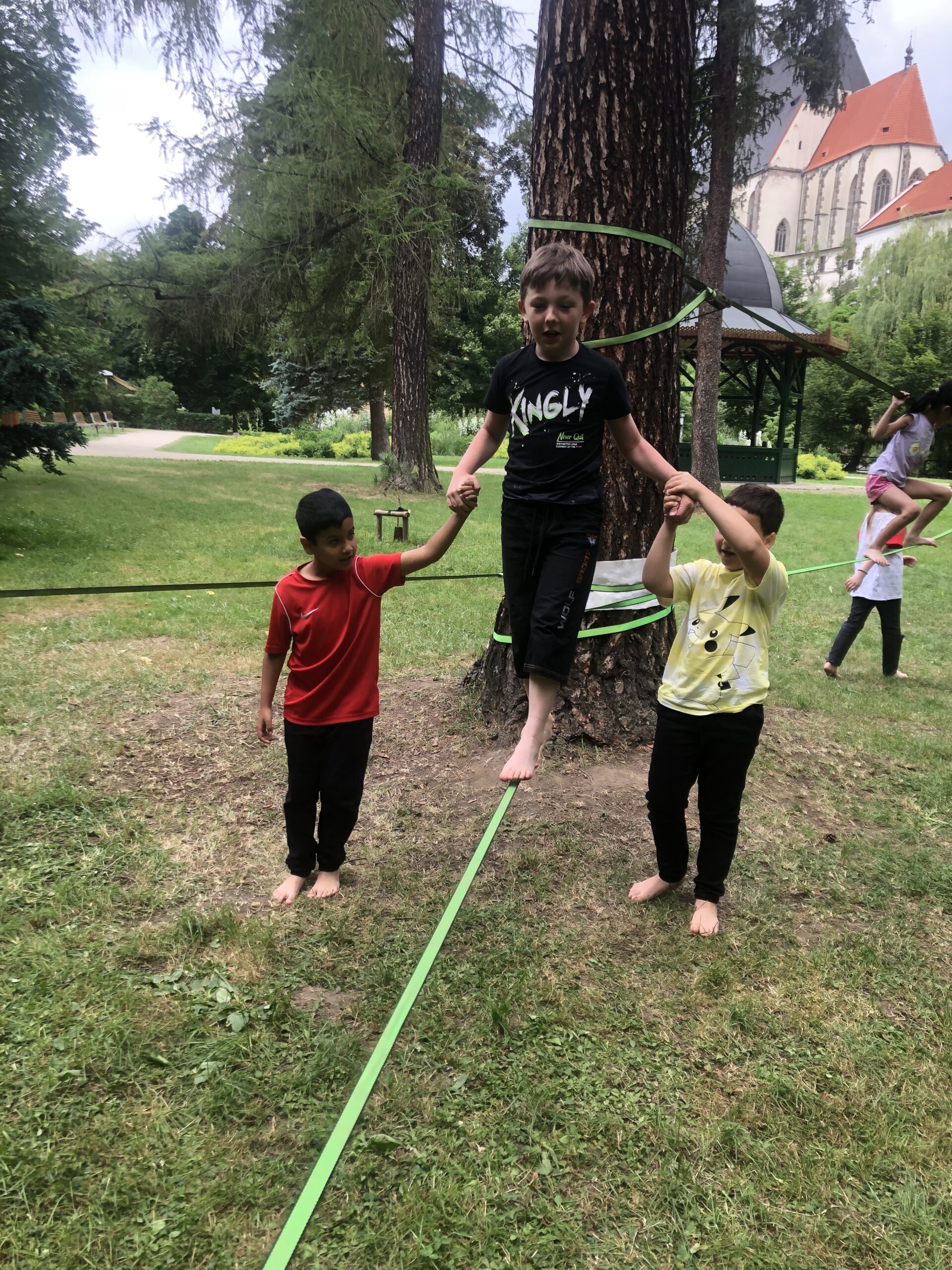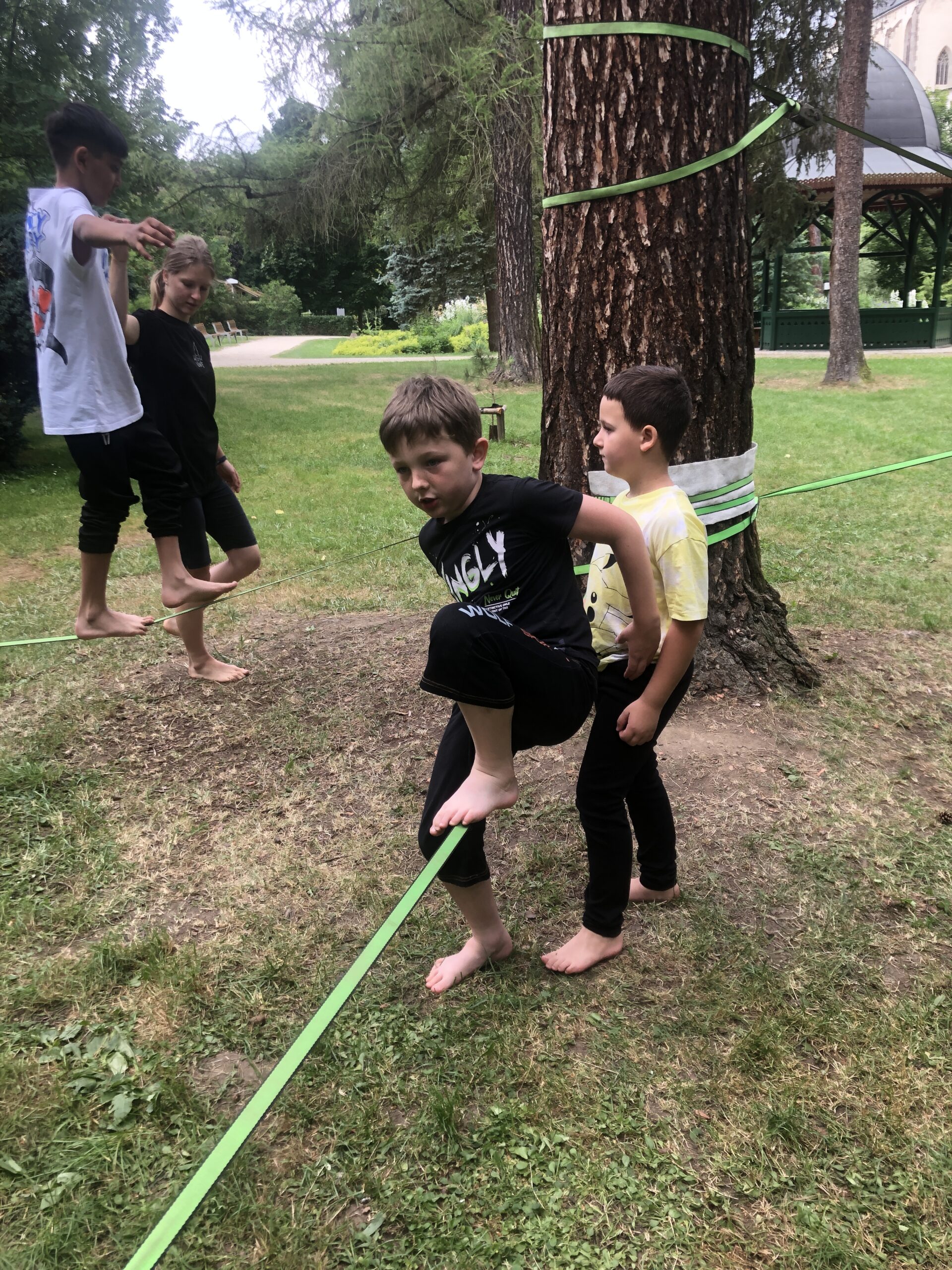 V pátek 23. 6. navštívilo několik tříd Městský park, kde se konala ukázka lezení a balančních cvičení na lajnách – Slackline akademie pro školy v rámci Highline Festivalu Český Krumlov 2023. Děti si mohly vyzkoušet, jak je náročné se na lajnu nejen dostat, ale i udržet rovnováhu a přejít ji. Byly nadšené, trénovaly o sto šest a z parku se jim ani nechtělo. Ze starších ročníků někdo odvahu a zájem měl, někdo pouze sledoval výkony ostatních.