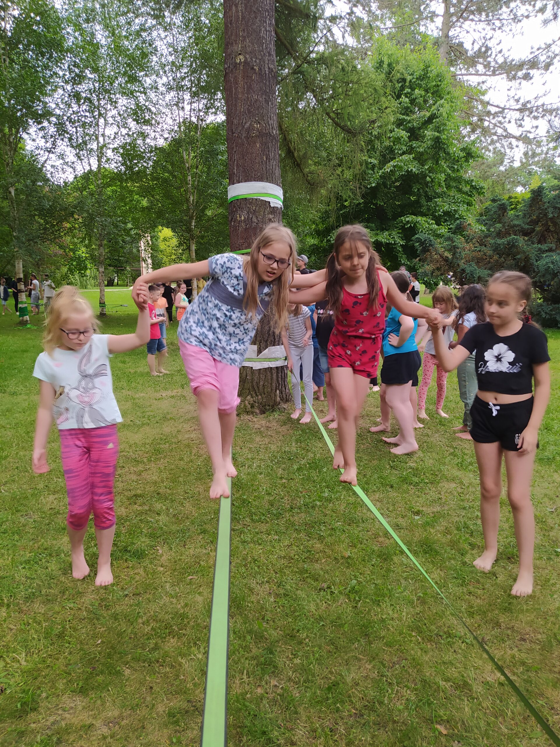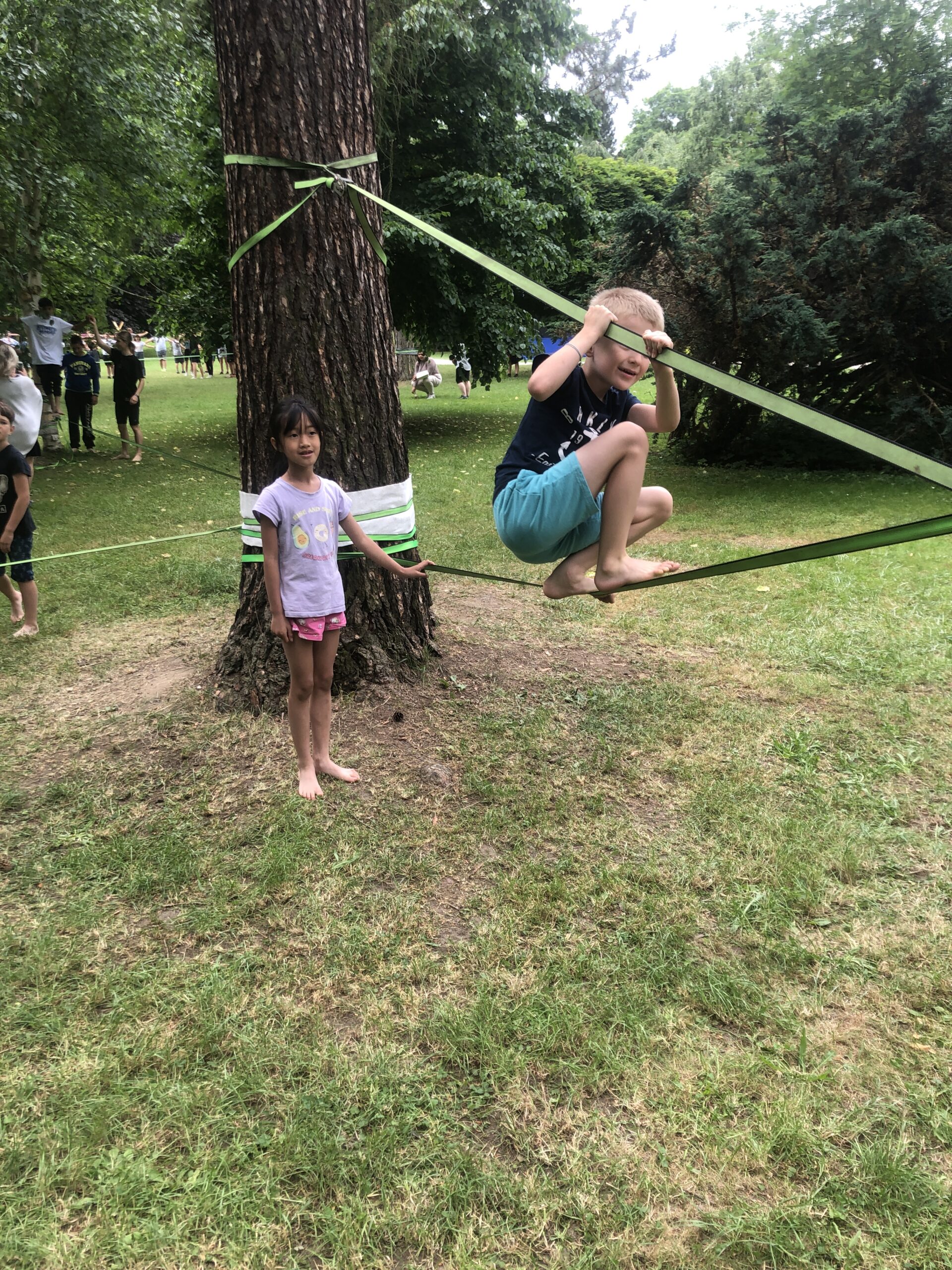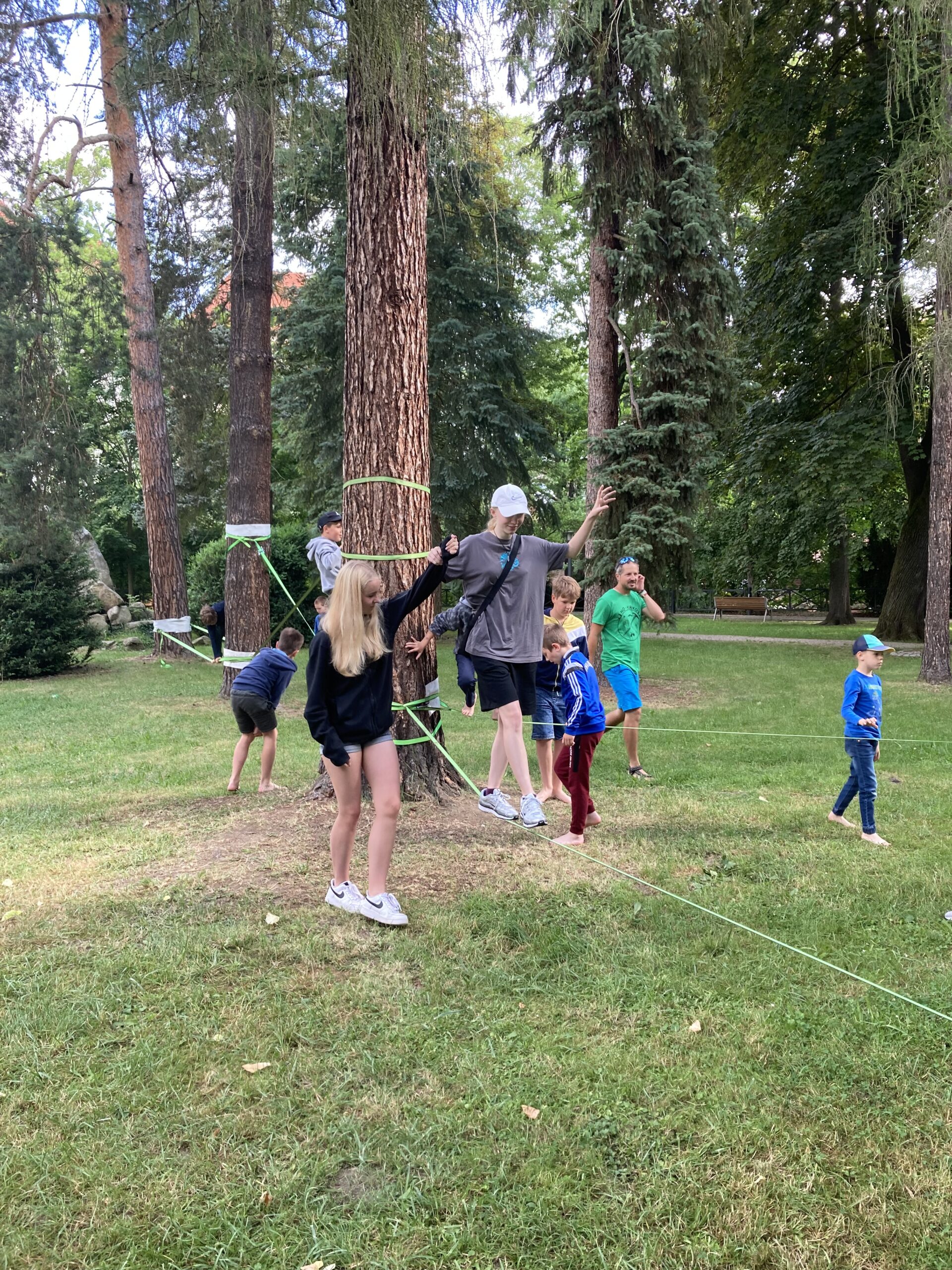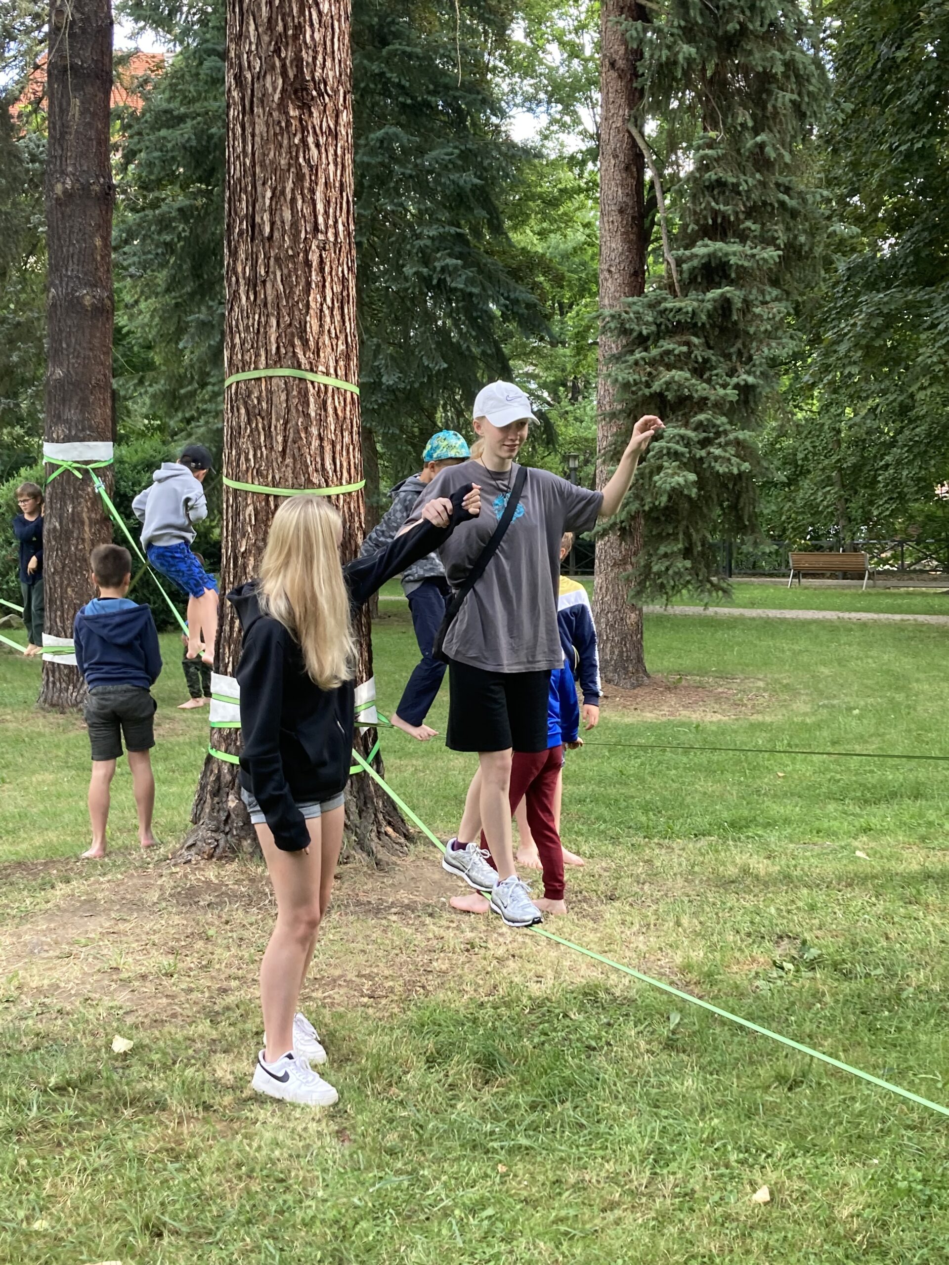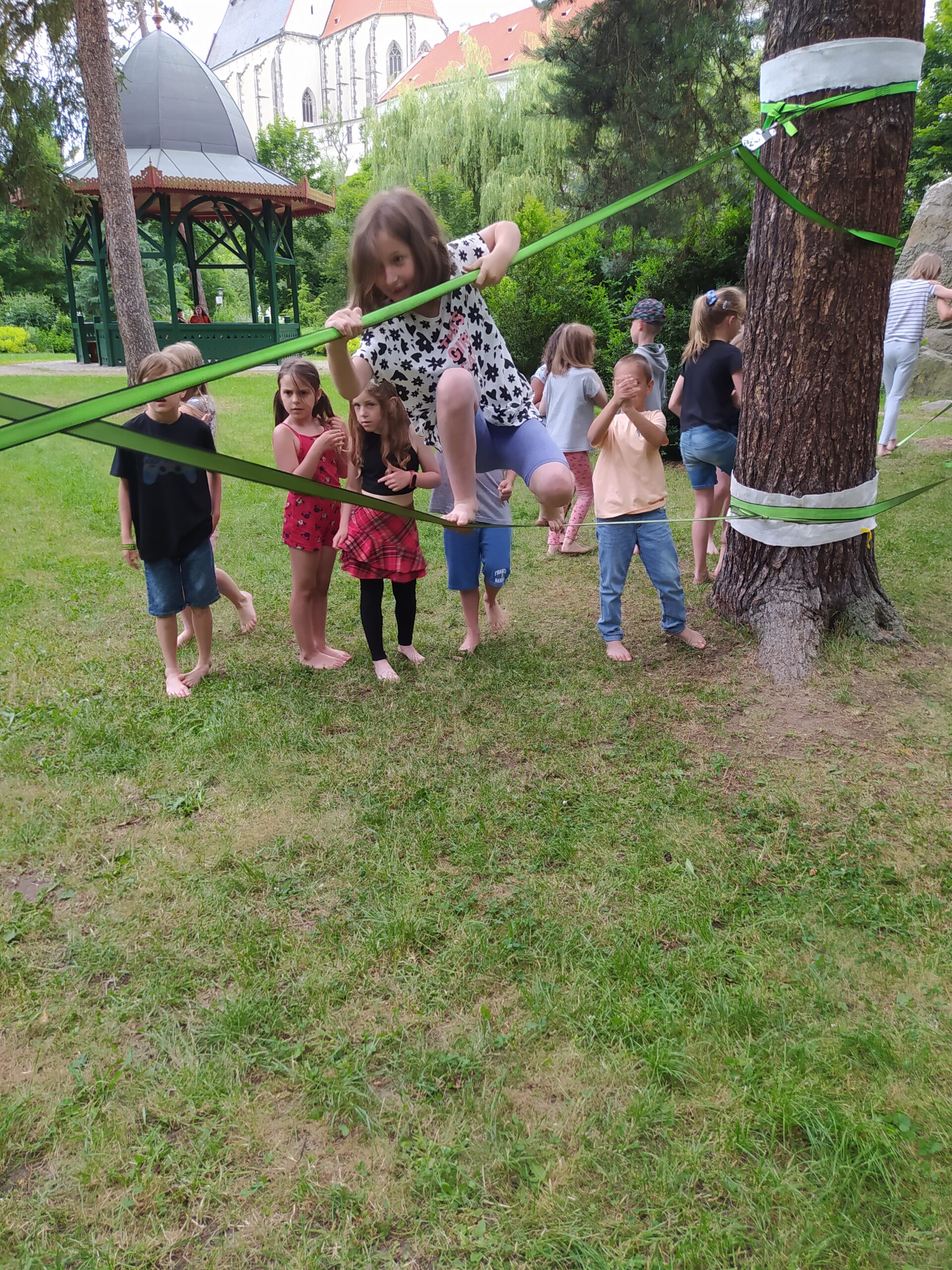 V pátek 23. 6. navštívilo několik tříd Městský park, kde se konala ukázka lezení a balančních cvičení na lajnách – Slackline akademie pro školy v rámci Highline Festivalu Český Krumlov 2023. Děti si mohly vyzkoušet, jak je náročné se na lajnu nejen dostat, ale i udržet rovnováhu a přejít ji. Byly nadšené, trénovaly o sto šest a z parku se jim ani nechtělo. Ze starších ročníků někdo odvahu a zájem měl, někdo pouze sledoval výkony ostatních.
