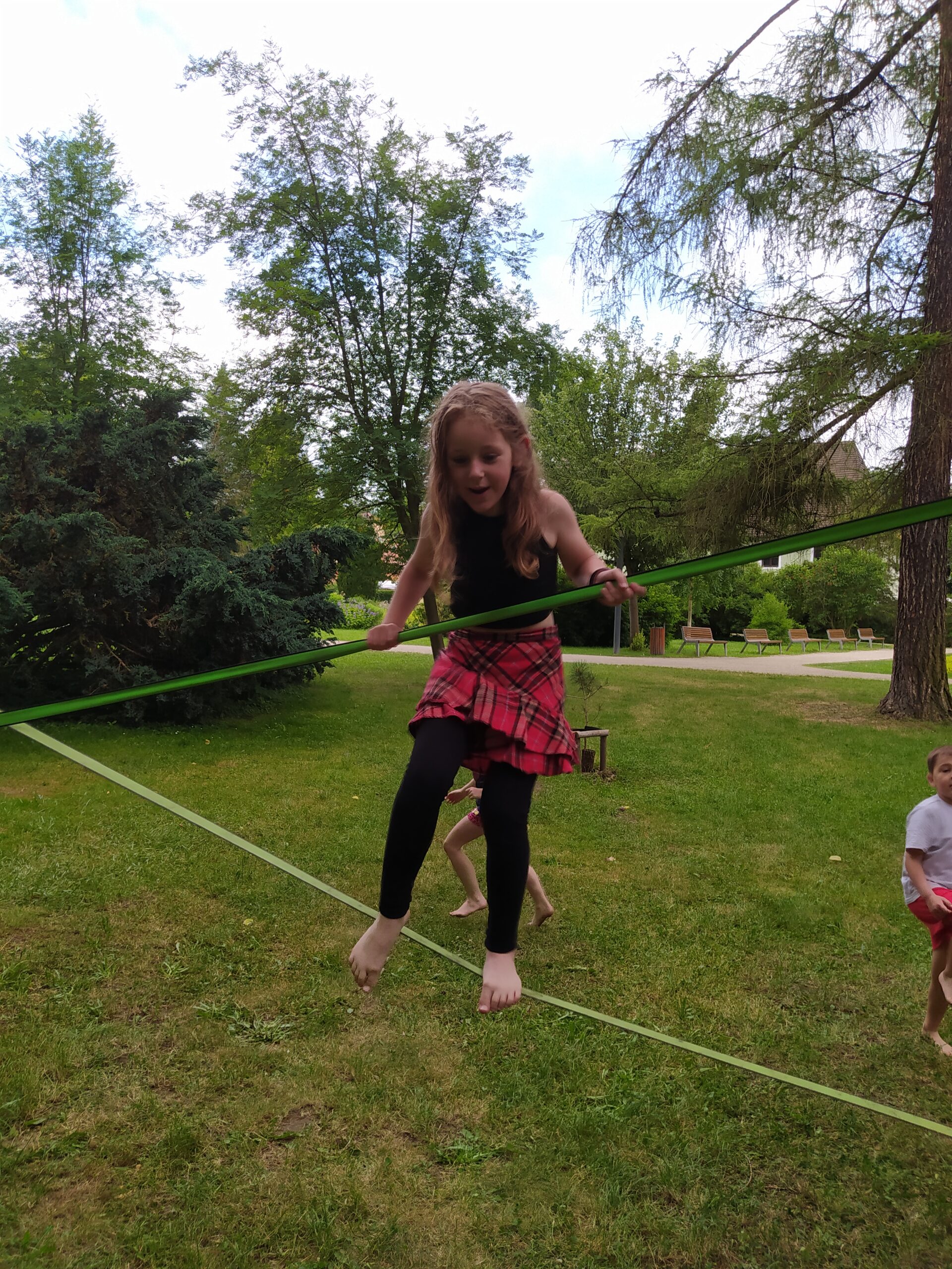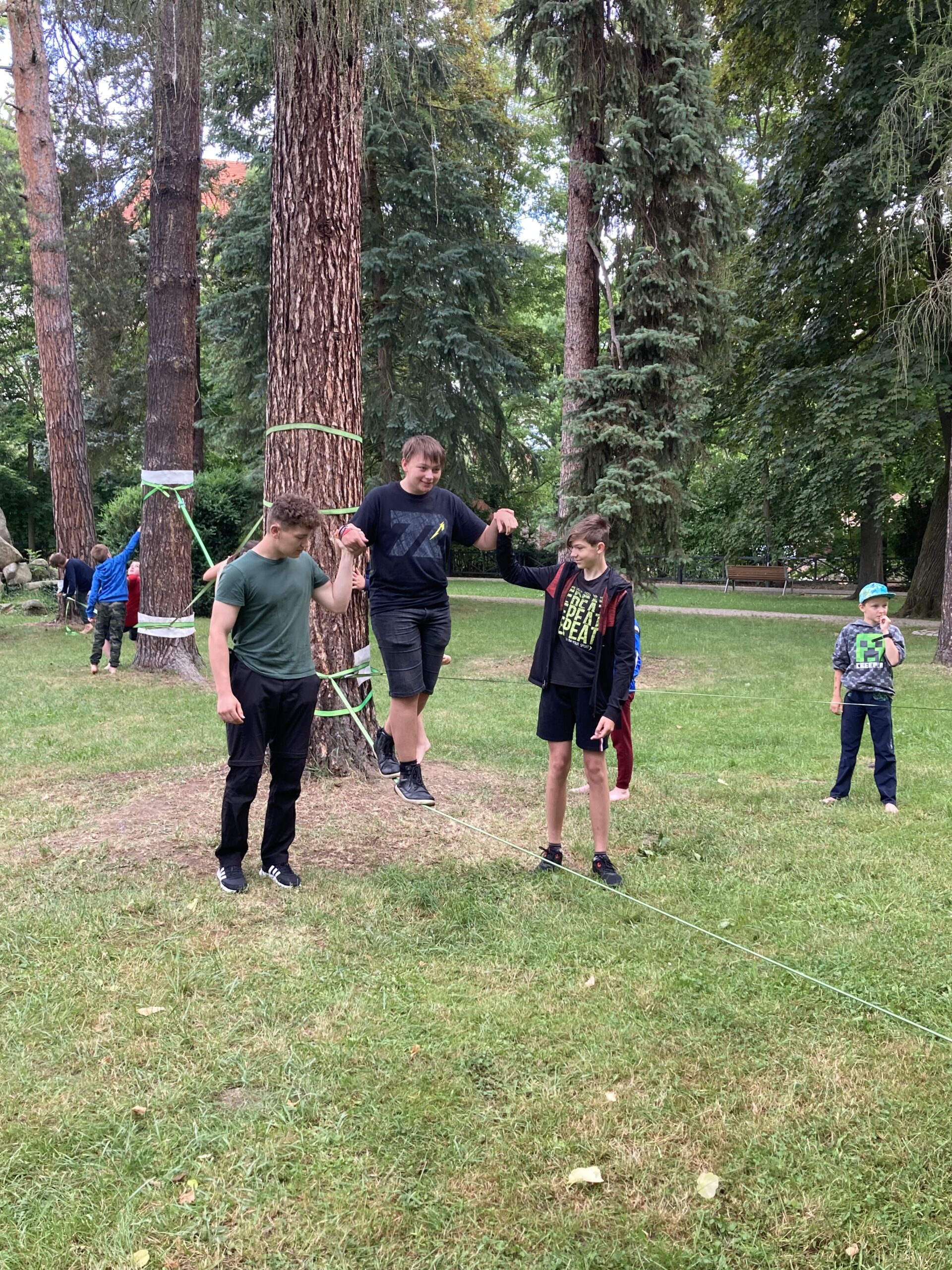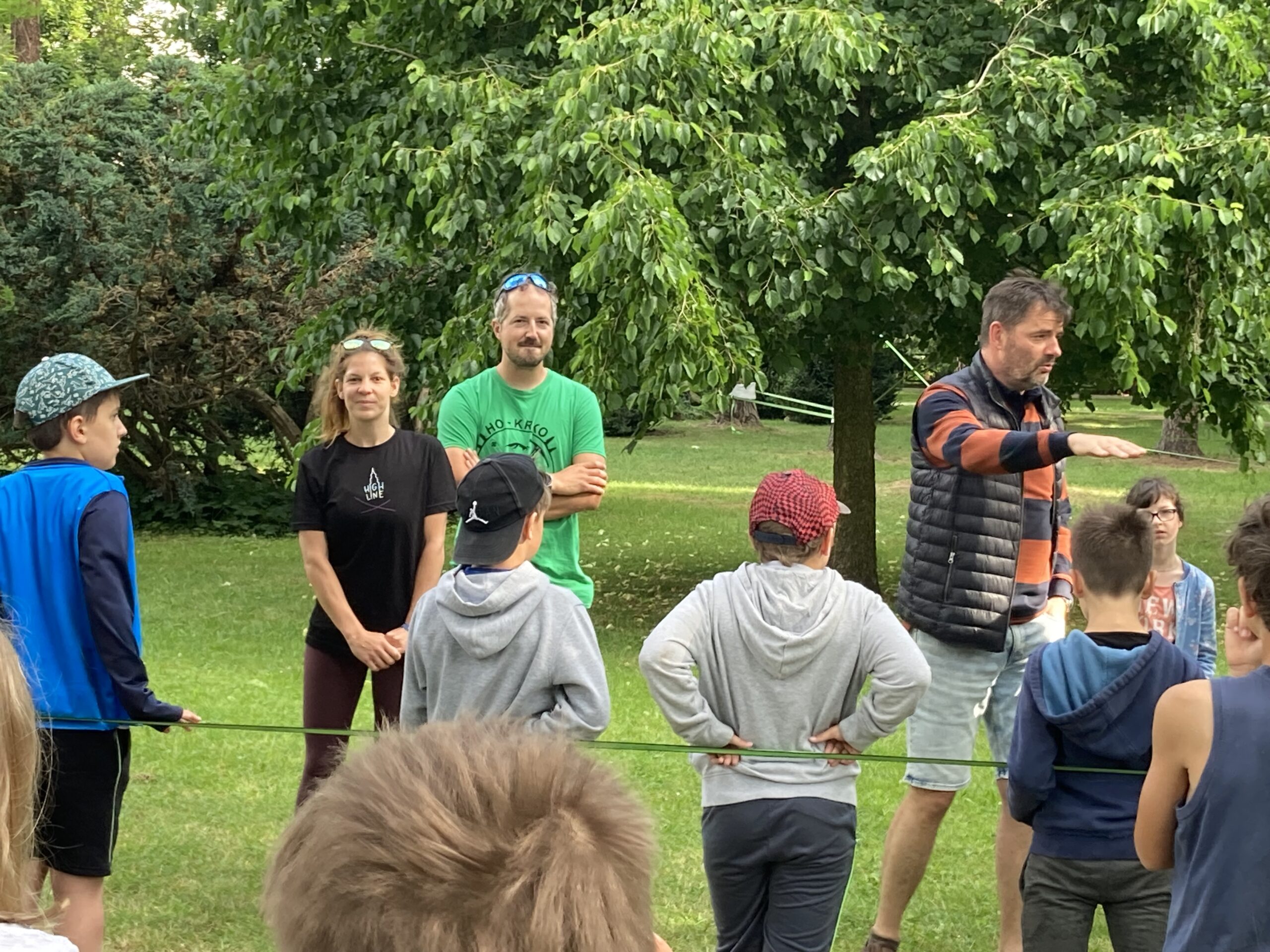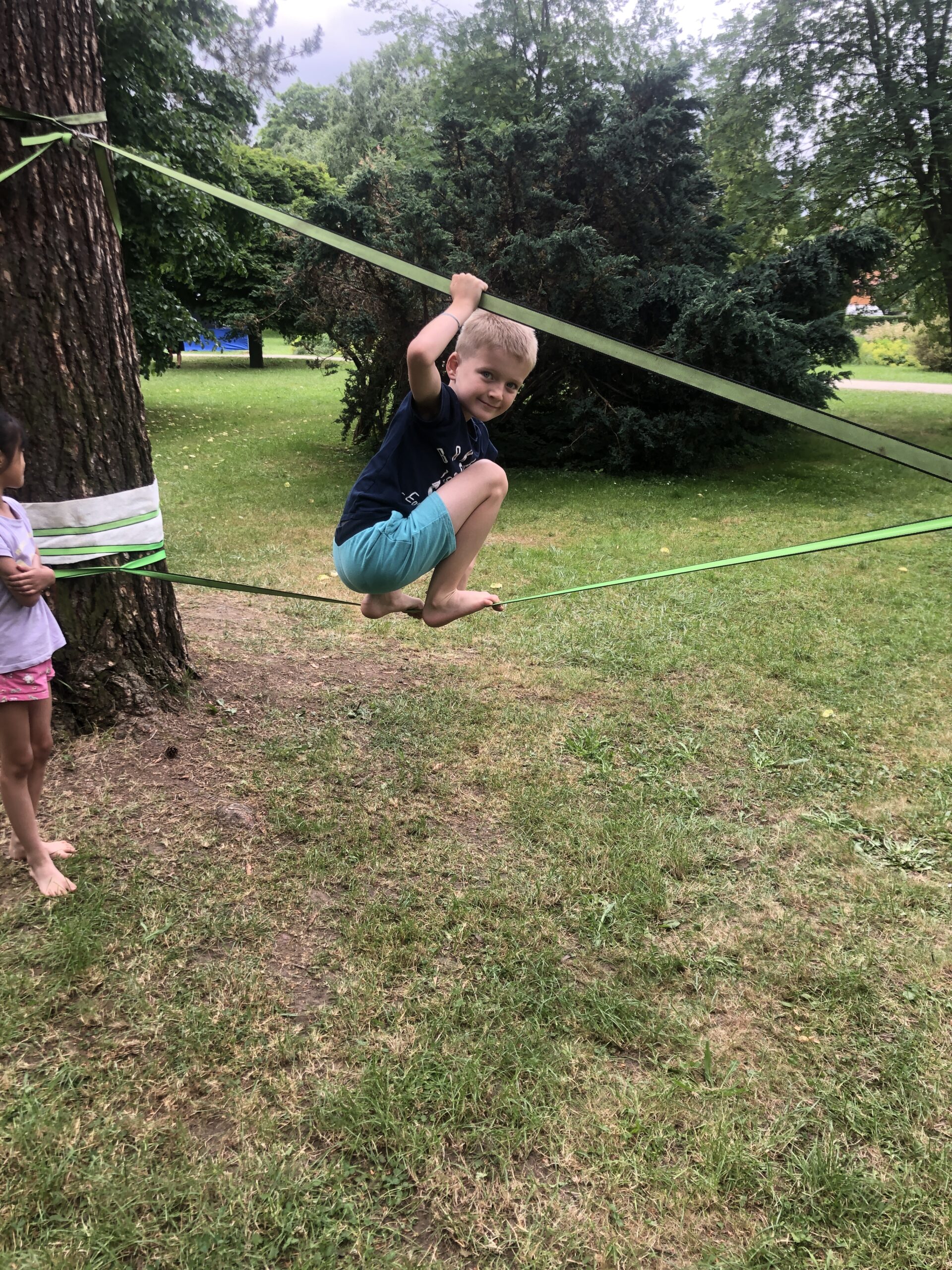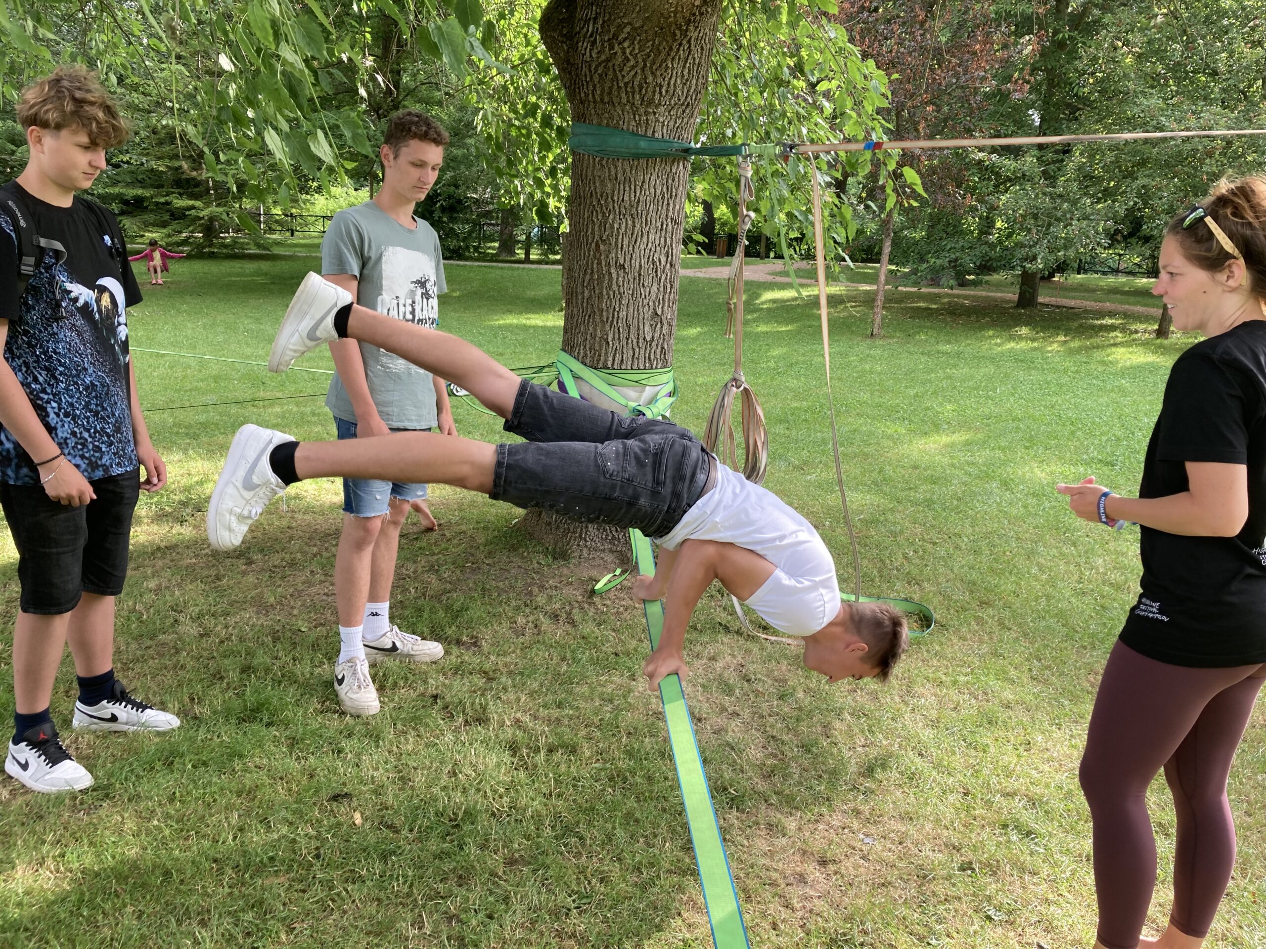 V pátek 23. 6. navštívilo několik tříd Městský park, kde se konala ukázka lezení a balančních cvičení na lajnách – Slackline akademie pro školy v rámci Highline Festivalu Český Krumlov 2023. Děti si mohly vyzkoušet, jak je náročné se na lajnu nejen dostat, ale i udržet rovnováhu a přejít ji. Byly nadšené, trénovaly o sto šest a z parku se jim ani nechtělo. Ze starších ročníků někdo odvahu a zájem měl, někdo pouze sledoval výkony ostatních.
